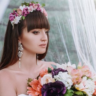 Особой популярностью для свадебных фотосессий пользуются венки из ярких крупных или мелких цветов и листьев. Свадебные венки всегда выглядят очень нежно и добавят женственному образу невесты чувственности, а также придадут невероятную трогательность.